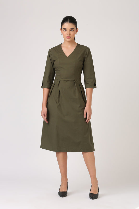 Pleated Olive Midi Dress