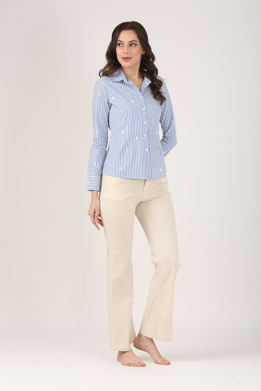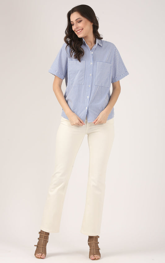 Cotton Brown Striped Embroidered Short Sleeve Shirt