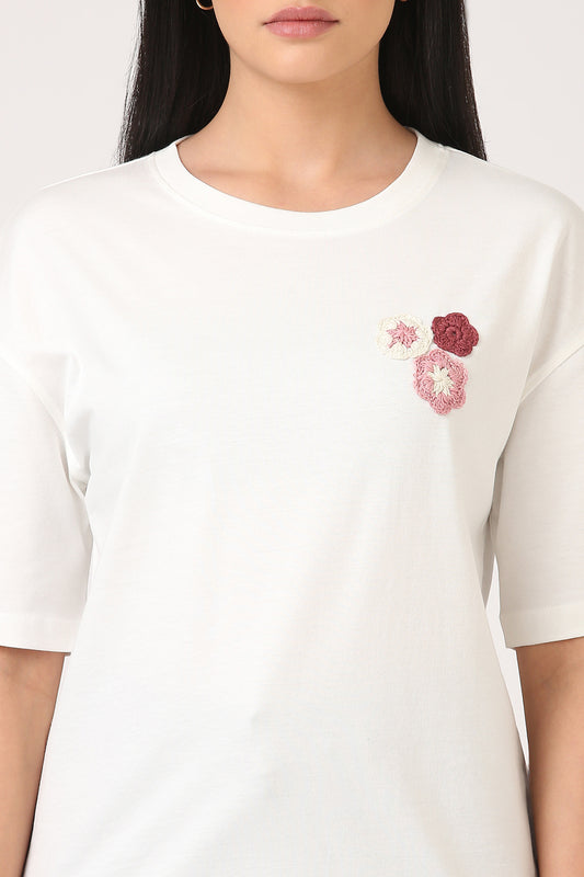 White Oversized T-Shirt with Pink Crochet