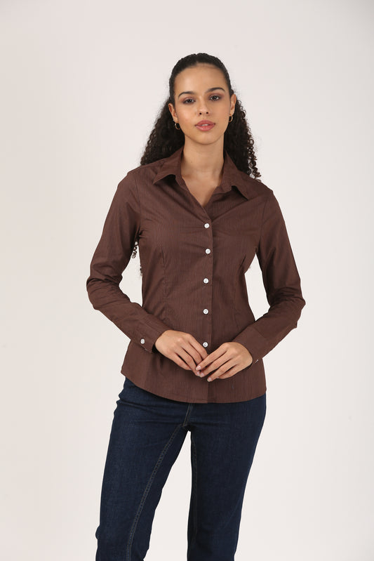 Cotton Brown Striped Embroidered Short Sleeve Shirt