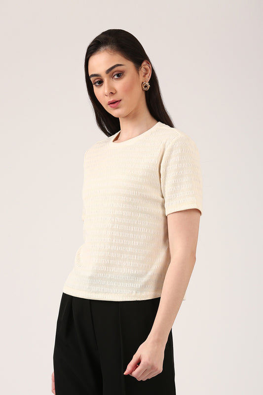 Cream Smocked Textured Top For Women