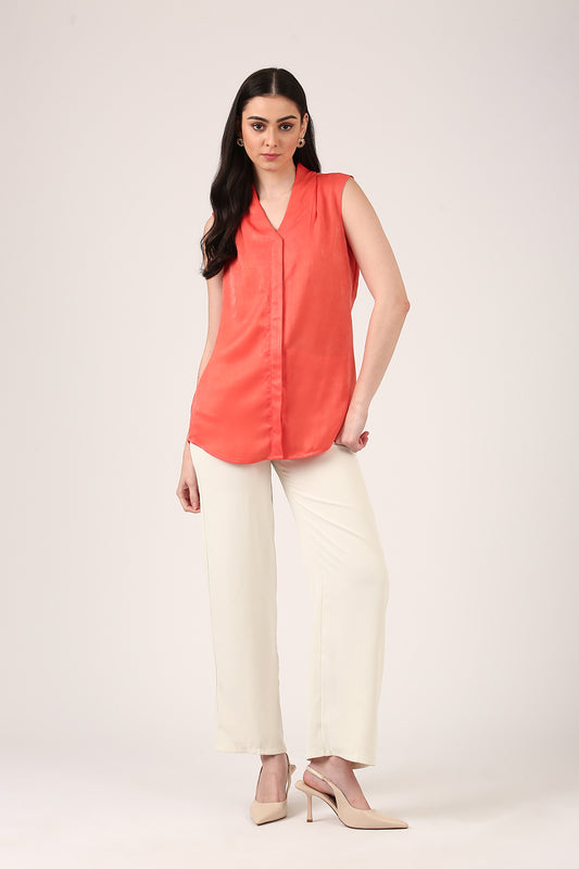 Coral Pink Sleeveless Silk Top for Women – V-Neck Formal Workwear Blouse