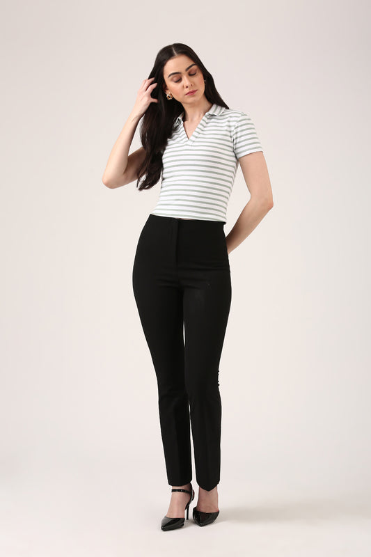 Ribbed Striped Polo Top – Short Sleeve Fitted Top